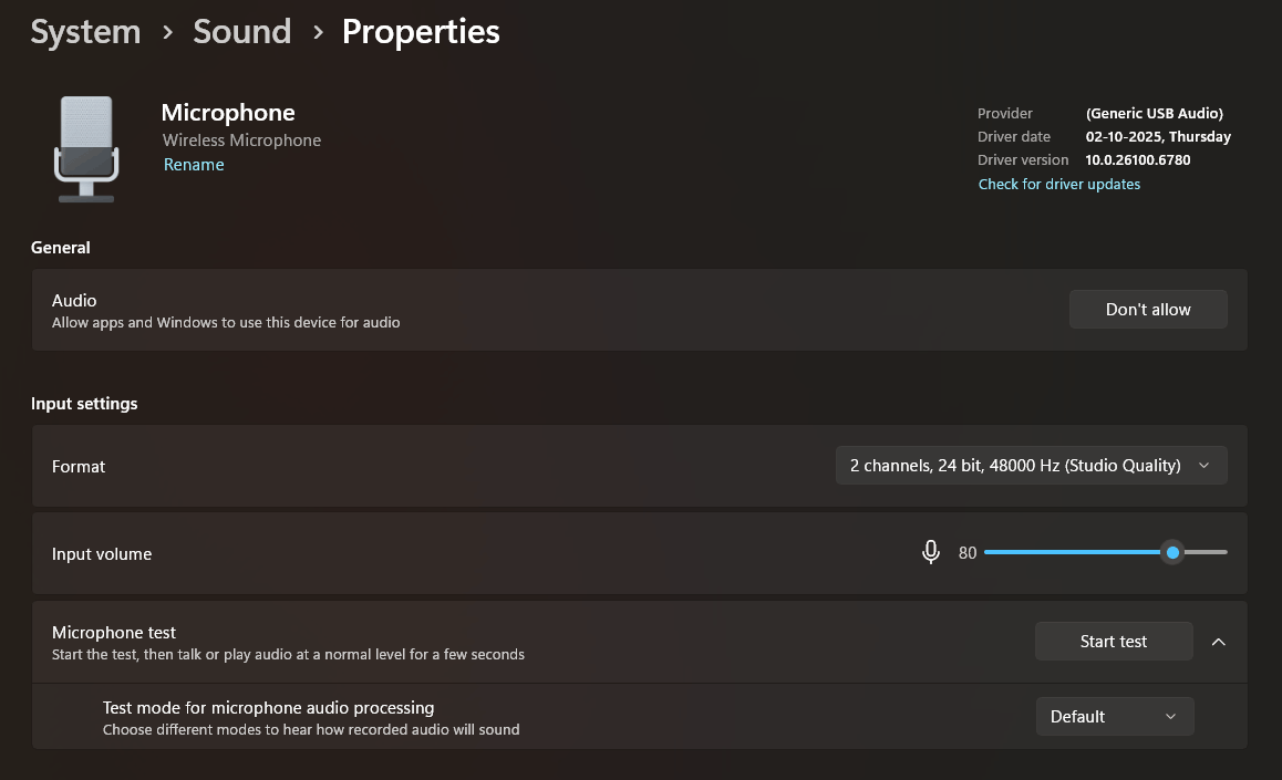 The device appears like a generic wireless microphone in Windows 11. You don’t need to install any drivers for this. You can choose the formats or set the volume here. The formats can be 16-bit, 48 KHz or 24-bit 48 KHz. You can not configure anything else. To configure the other parameters of the the microphones, you need to connect them to an Android or iOS device and use the configuration app.