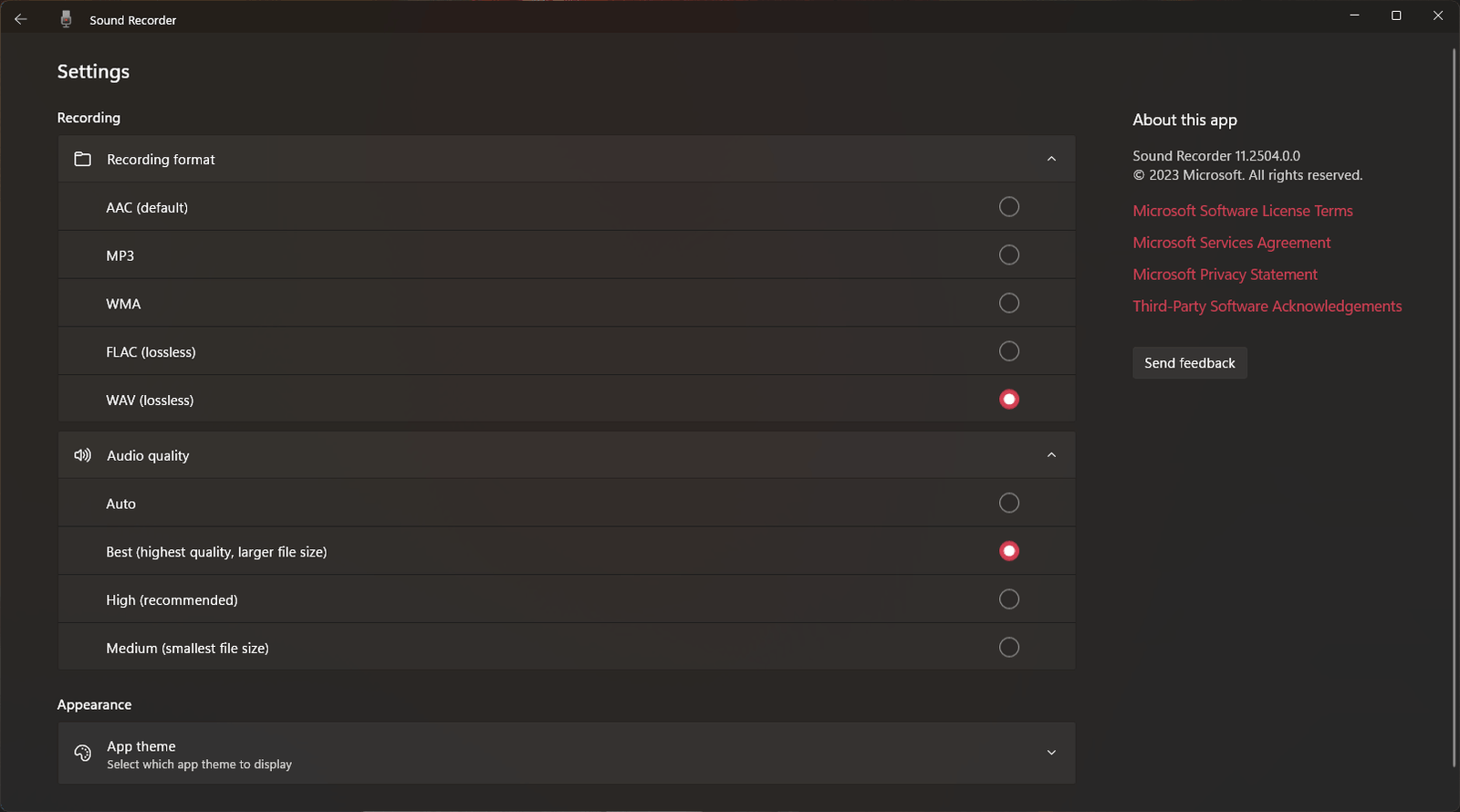 In the Xiaomi Pad 7, I first used the default audio recorder application. The quality was set to WAV. It did not allow me to set any other settings than that. The recording again turned out to be in 16-bit, 48 KHz instead of 24-bit, 48 KHz.